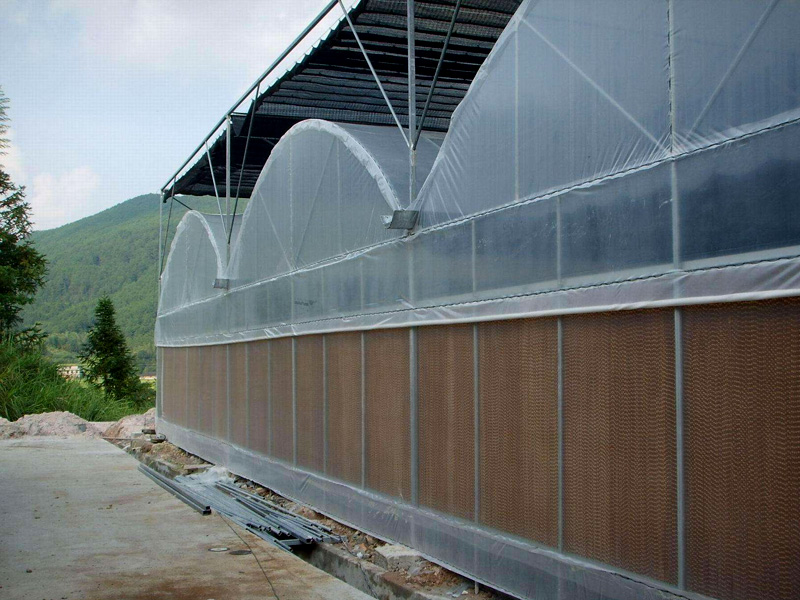 4、采用吸濕性良好的保溫幕材料。透濕和吸濕性良好的保溫幕材料,如無紡布能夠阻止棚內表面結露,并可防止露水落到植株上,從而降低連棟溫室空氣濕度。